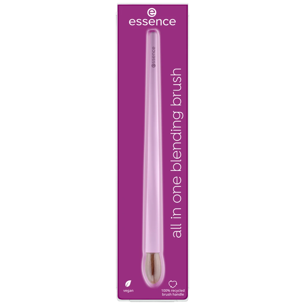 essence All in One Blending Brush is perfect for cream and powder products, offering a versatile shape for achieving a flawless makeup look. With soft bristles and a soft-touch handle, it excels in blending eyeshadow, highlighting cheeks, and setting skin with powder. Its unique design is complemented by an eco-friendly touch— the handle is crafted from 100% recycled material.